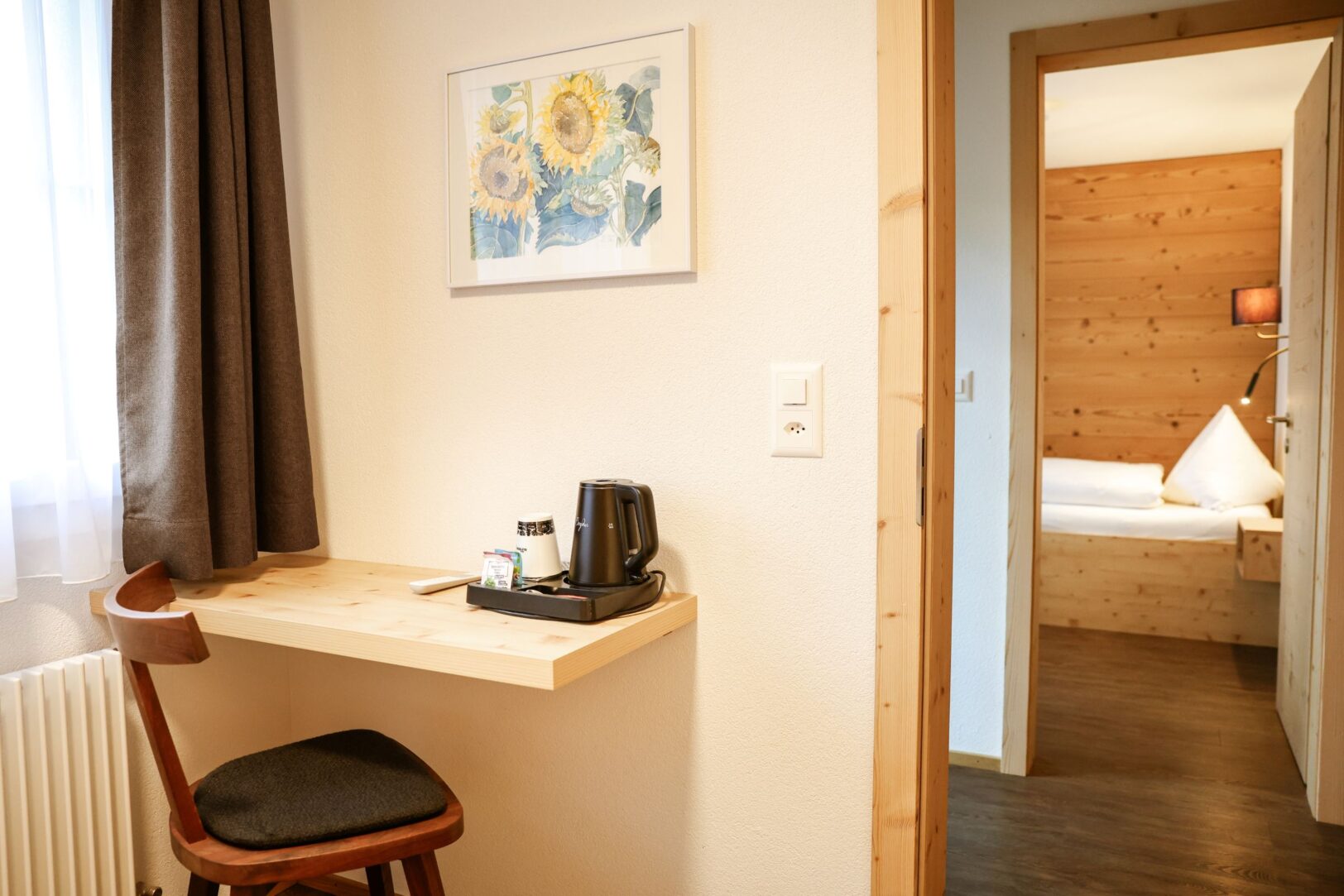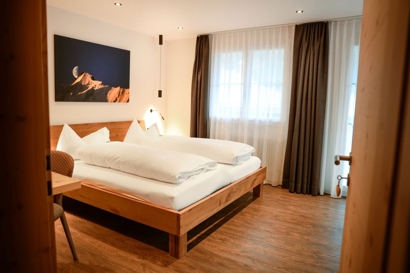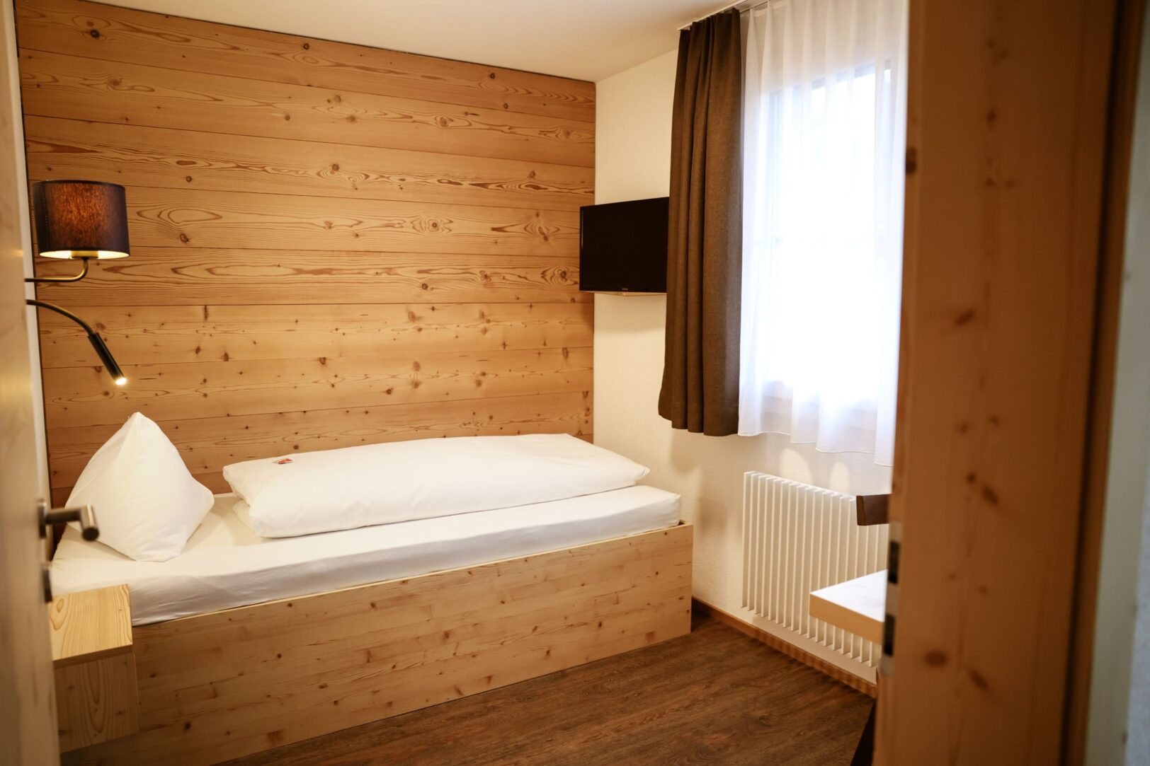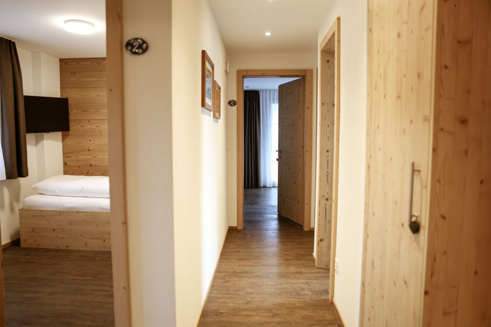 Chambre double avec 1 lit double, 2 chambres individuelles avec 1 lit simple chacune, douche/WC, TV écran plat, WLAN gratuit, balcon plein sud, vue sur les montagnes, linge de lit, de bain, machine à laver et sèche-linge à pièces dans l’hôtel, appartement non-fumeur, parking, carte d’invité incluse