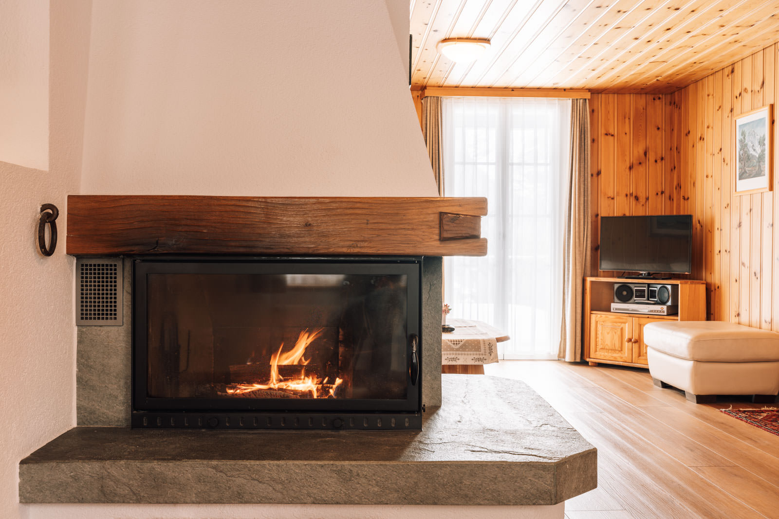 Chambre séparée avec 1 lit double, 1 à 2 lits supplémentaires, douche/WC, TV écran plat, Wifi gratuit, terrasse, vue sur les montagnes, coin salon extérieur, canapé, cuisine, cheminée, draps de lit, linge de toilette, torchons de cuisine, machine à laver, sèche-linge, appartement non-fumeur, parking, carte d’hôte incluse.