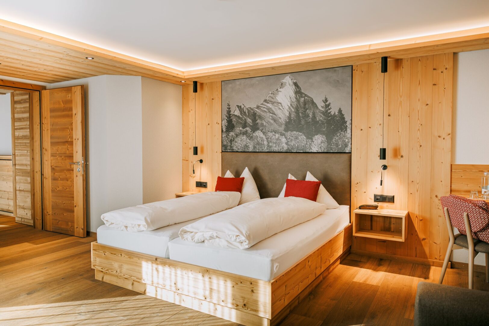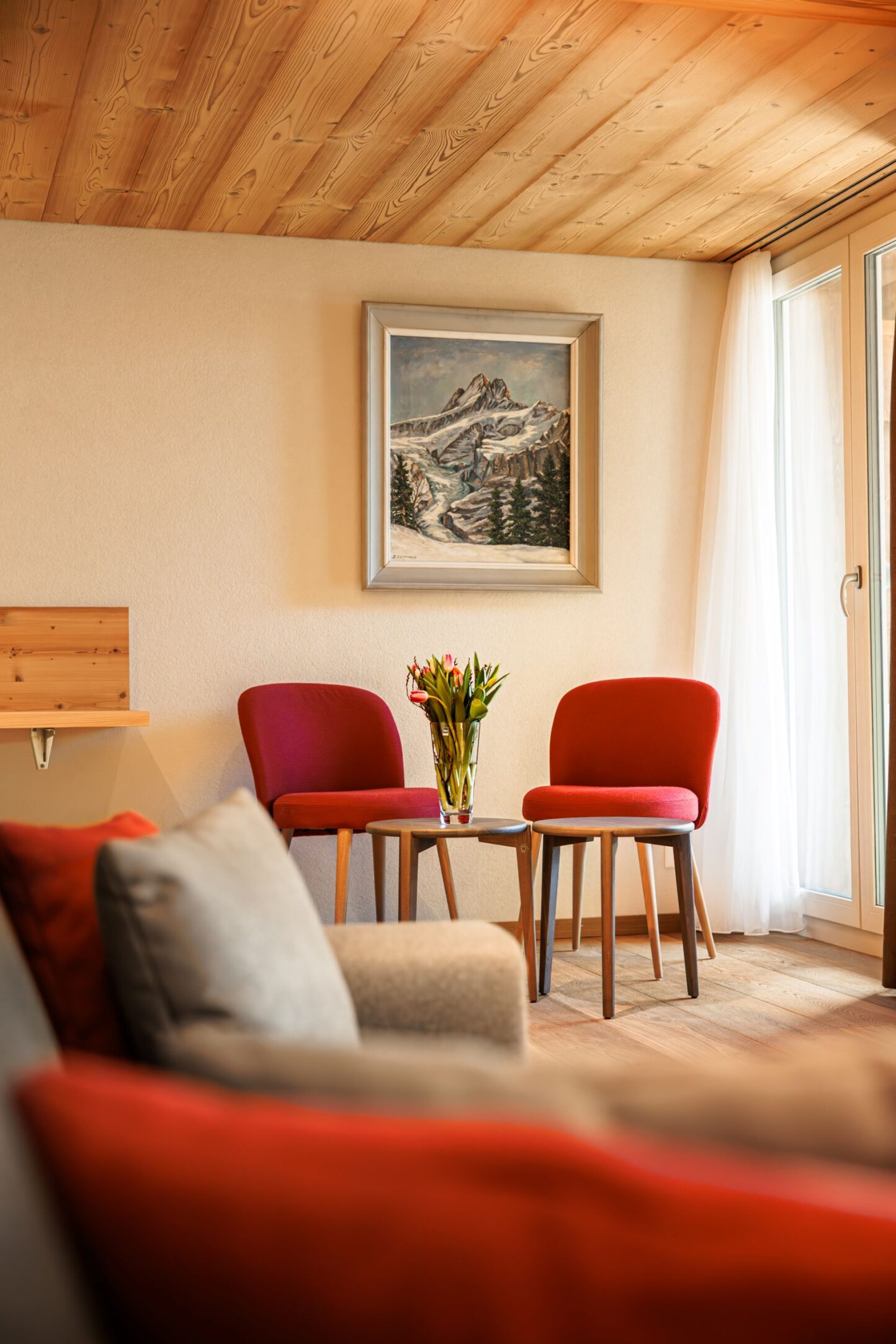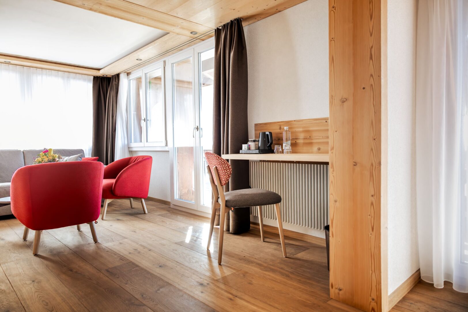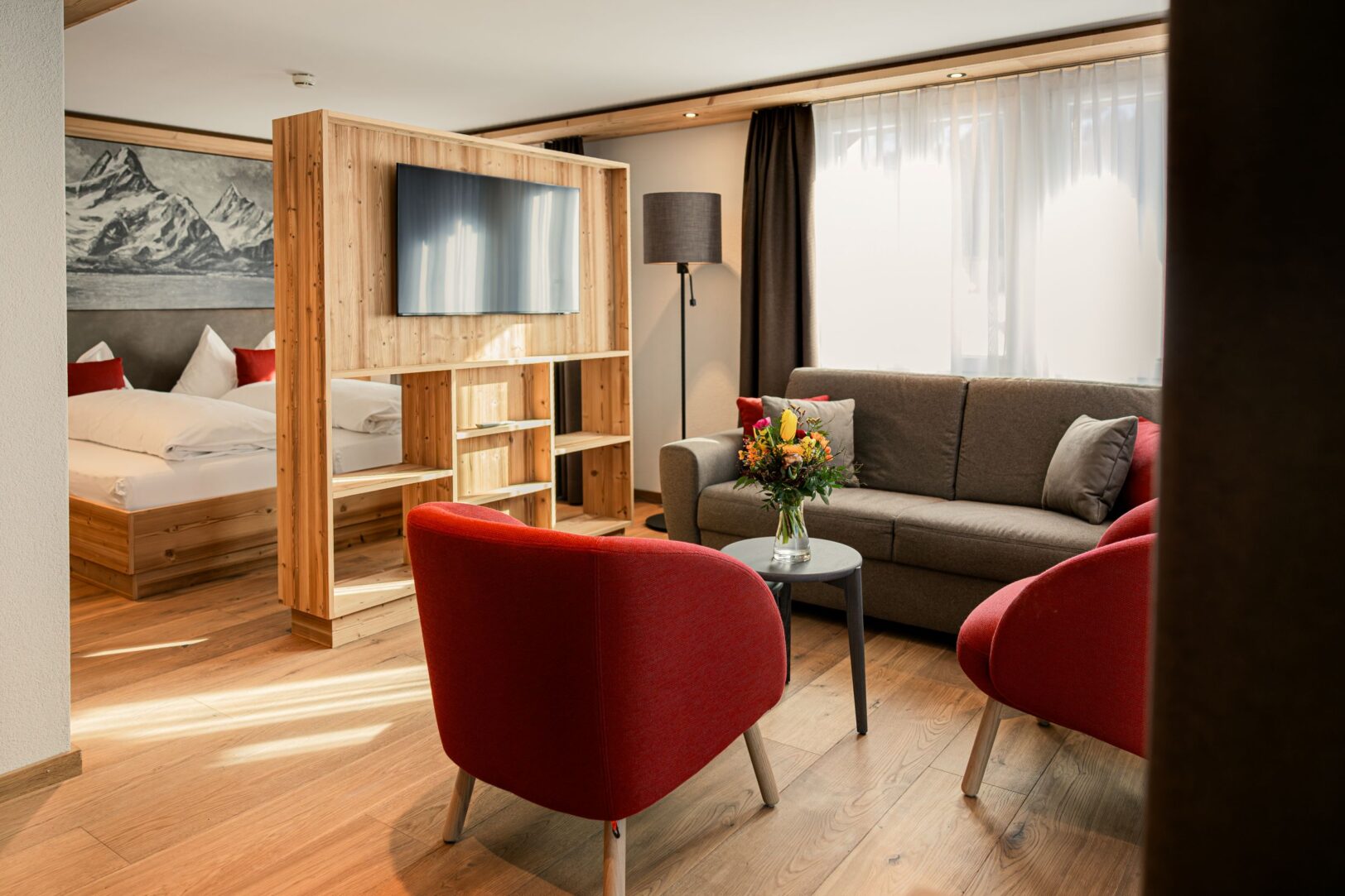 Unsere neu renovierten Junior Suiten empfangen Sie mit einer rustikalen Einrichtung und prachtvoller Aussicht auf die umliegende Berg-, Gletscher- oder Hügellandschaft. Diese Zimmerkategorie ist ideal geeignet für Familien mit bis zu vier Personen.
